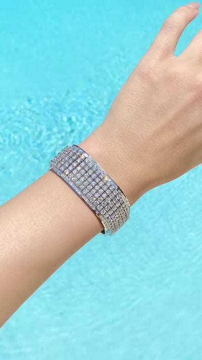 A statement in every sense, this 1980s bracelet features five rows of round diamonds flanked by two rows of baguette diamonds in 18‑karat white gold. With 35 carats of diamonds in total, it’s a collectible vintage piece meant to shine on it's own.