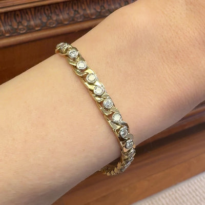 The upgrade your wrist stack didn’t know it needed—this 18-karat yellow gold curb link bracelet features 3 carats worth of platinum bezel-set diamonds. A piece you’ll keep in your rotation, style this vintage treasure with a timepiece and chic bangle.