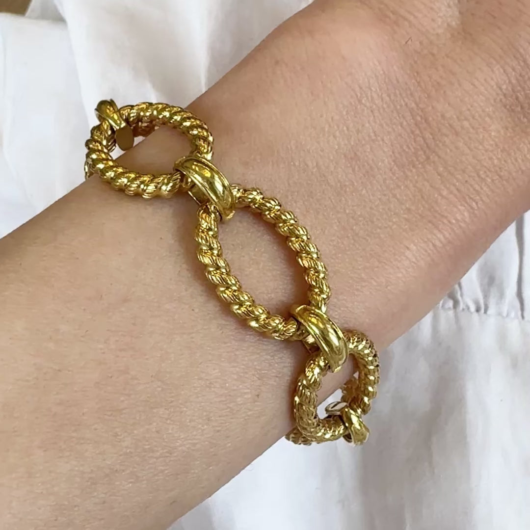Designed for day-to-night wear, this 18-karat yellow gold chain bracelet features twisted oval links joined by sleek beveled connectors for a polished finish. Let it anchor a slip dress or layer it with a timepiece and tailored blazer.