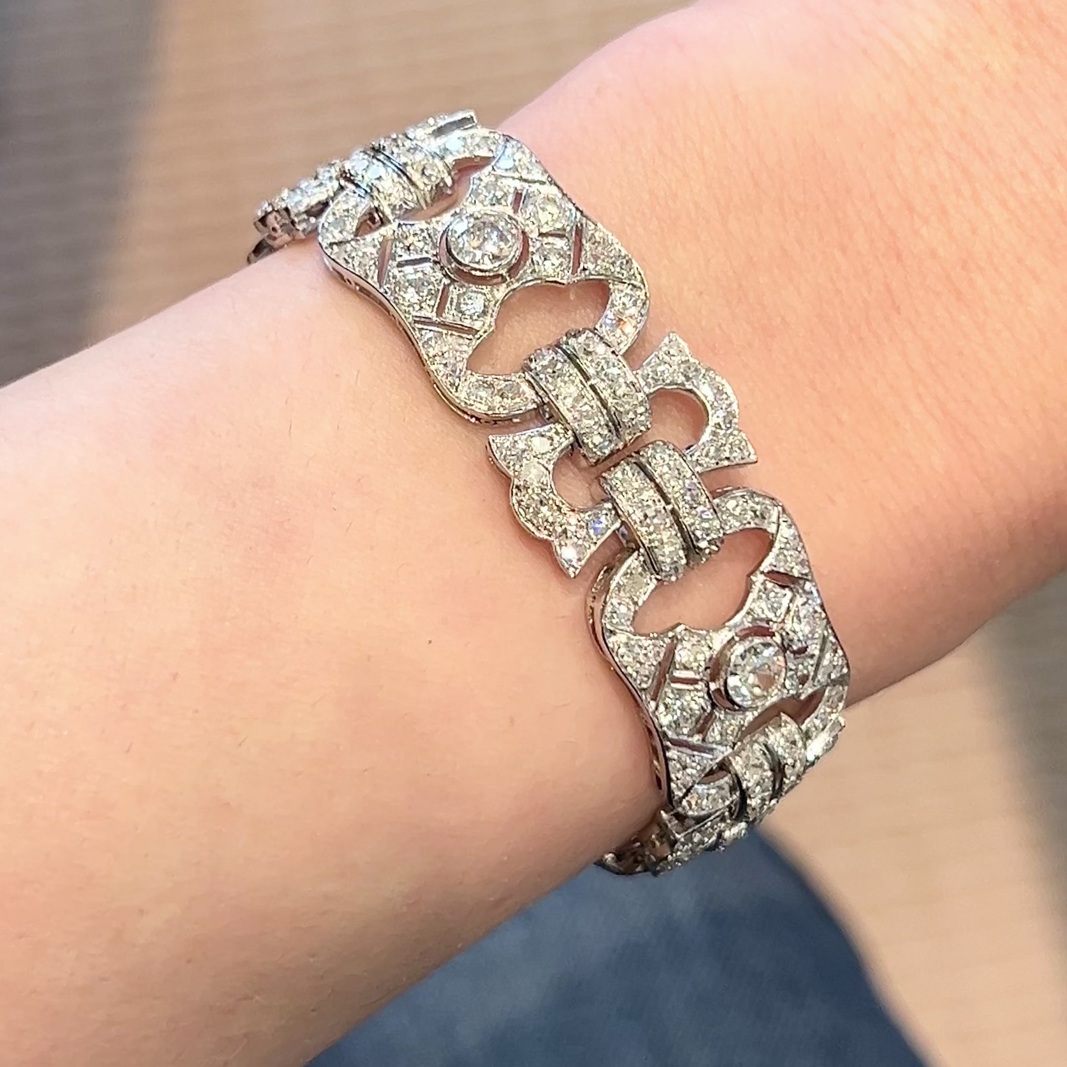 This Art Deco bracelet is typical of the bolder style of the 1930’s. The alternating curvilinear sections feature linked plaques with geometric openwork designs. The larger center diamonds are set in floating bezels to beautiful effect. This is a vintage bracelet that will never go out of style.