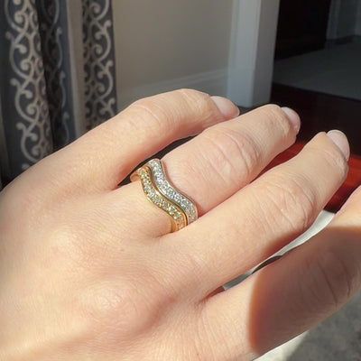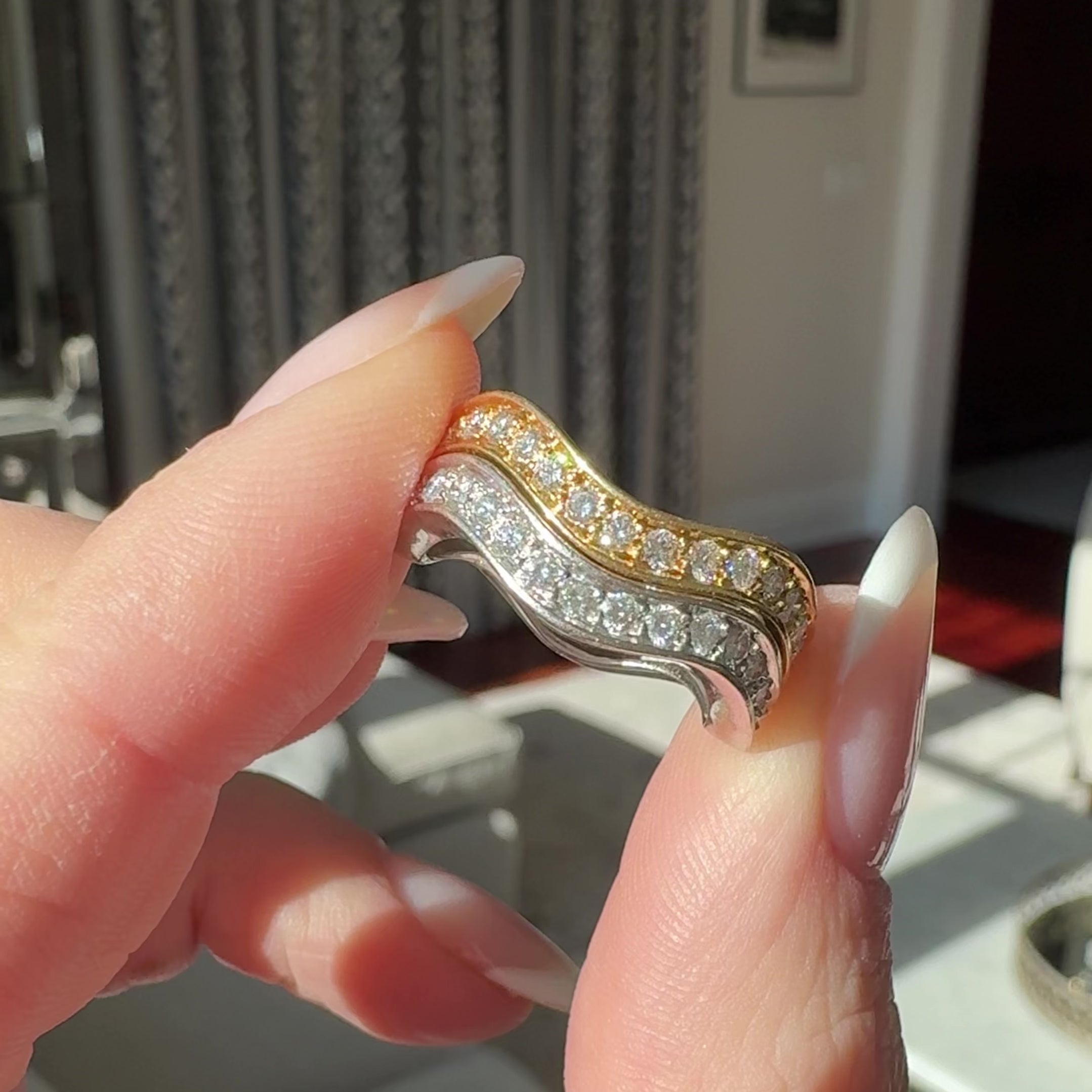 Cartier introduced the Neptune collection in the 1990's as part of a wave of sculptural, elemental designs. A mixed metal story, this pair of vintage rings in 18-karat white and yellow gold are the perfect everyday stacking rings. Glowing with round diamonds, they can be stacked together, worn individually or complement other staple rings in your collection, blending metal colors seamlessly. Both rings are signed Cartier with French hallmarks and are numbered.