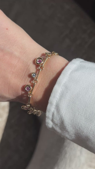 This Chaumet paper link bracelet is made in 18 karat yellow gold and set with sapphires in mixed blue and violet tones. Designed to sit easily alongside a watch or diamond tennis bracelet, it adds color without taking over the stack.